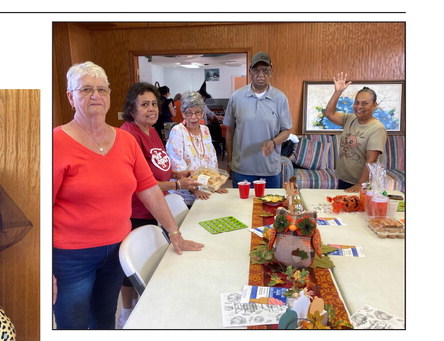 The Friends of Elders Center hosted their annual Halloween party. The woman with her hand raised, Martha Gonzales, was the cake walk winner.
