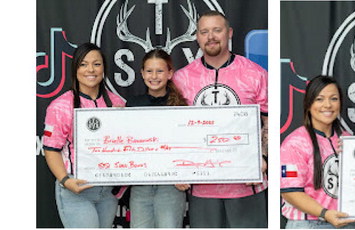 Youth Pro Staff Shooter Taylin Myers with owners Josie and Donny Harris being presented with a $250 signing bonus.