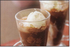 2. Put 1 scoop of coconut ice cream into each of 4 heatproof glasses, top with a scoop of chocolate ice cream, then repeat the layers.
